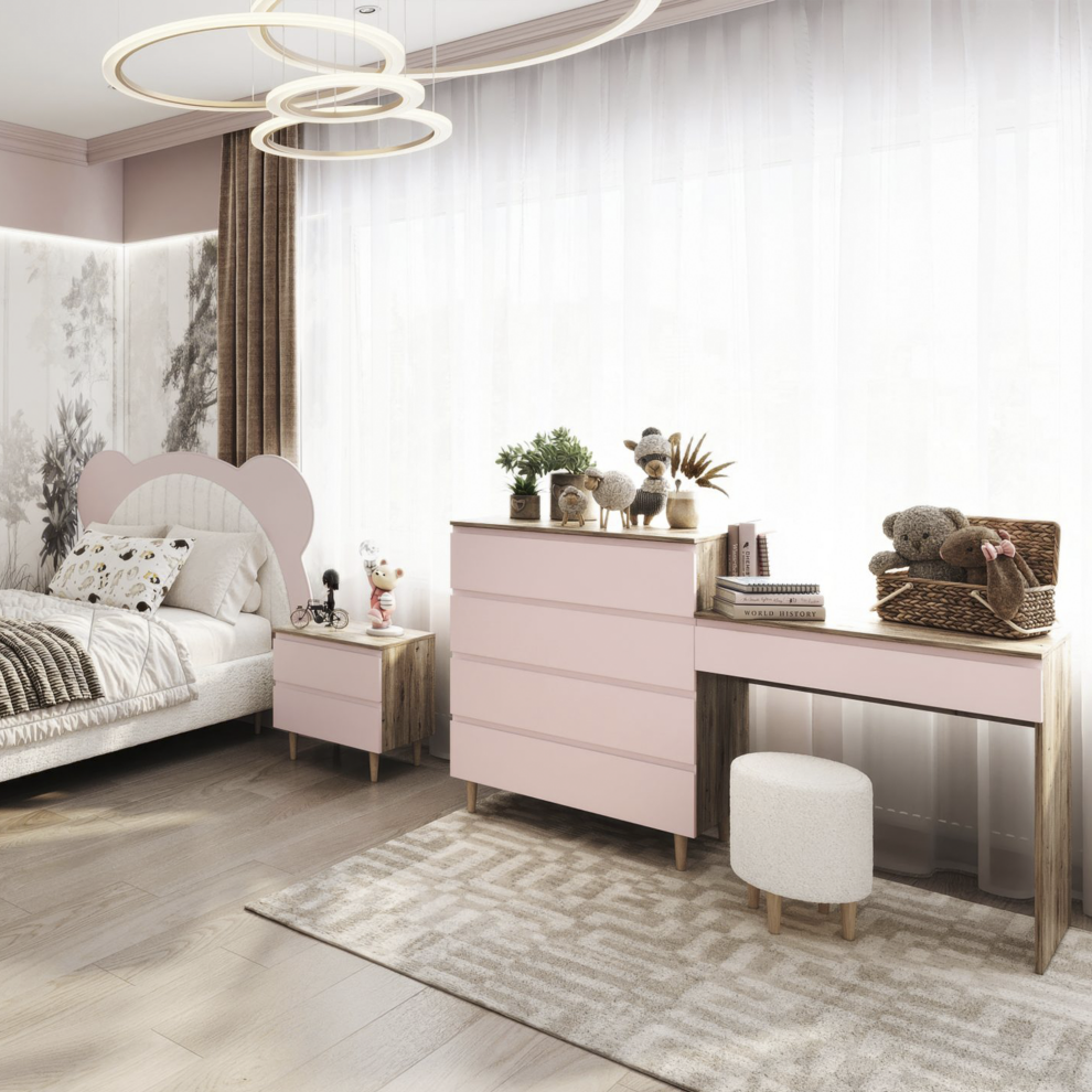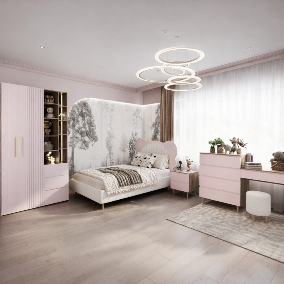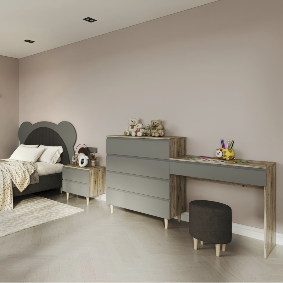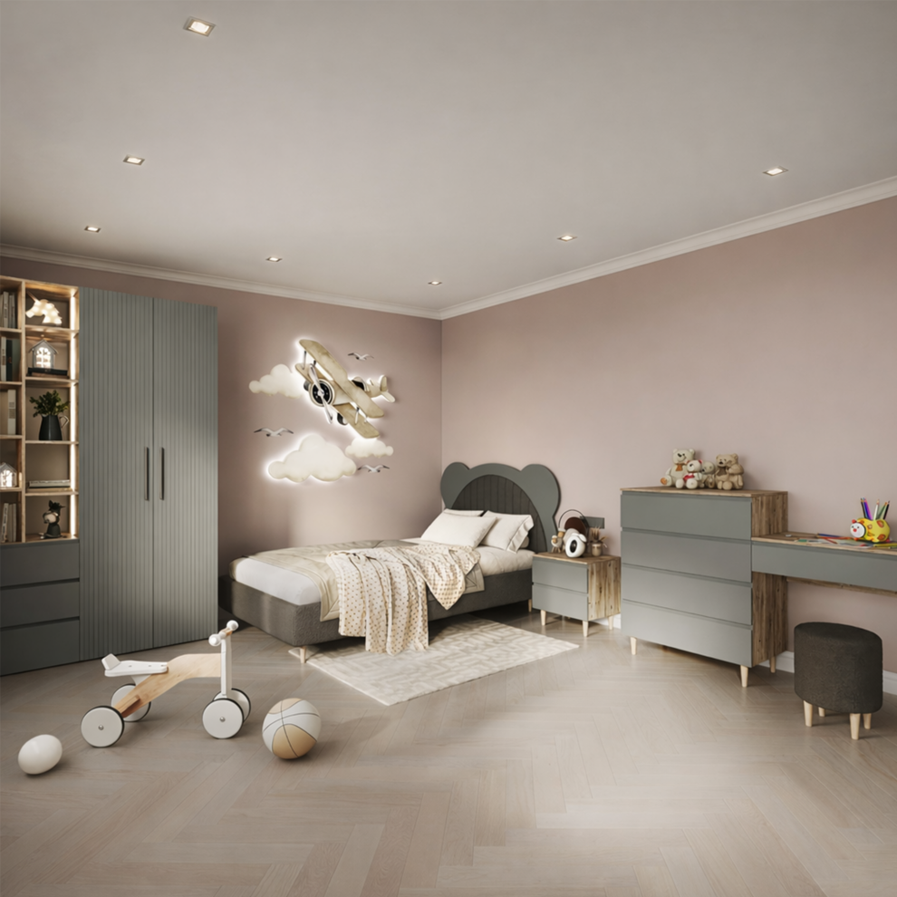 Коллекция объединяет стильный современный дизайн, мягкие формы и тёплые натуральные оттенки, создавая спокойную и гармоничную атмосферу в комнате. В комплект входят удобная кровать с декоративным изголовьем в форме мишки, вместительный шкаф, прикроватная тумба, комод и рабочая зона со столом. Продуманная система хранения помогает поддерживать порядок, а эргономичная мебель обеспечивает комфорт в повседневной жизни.