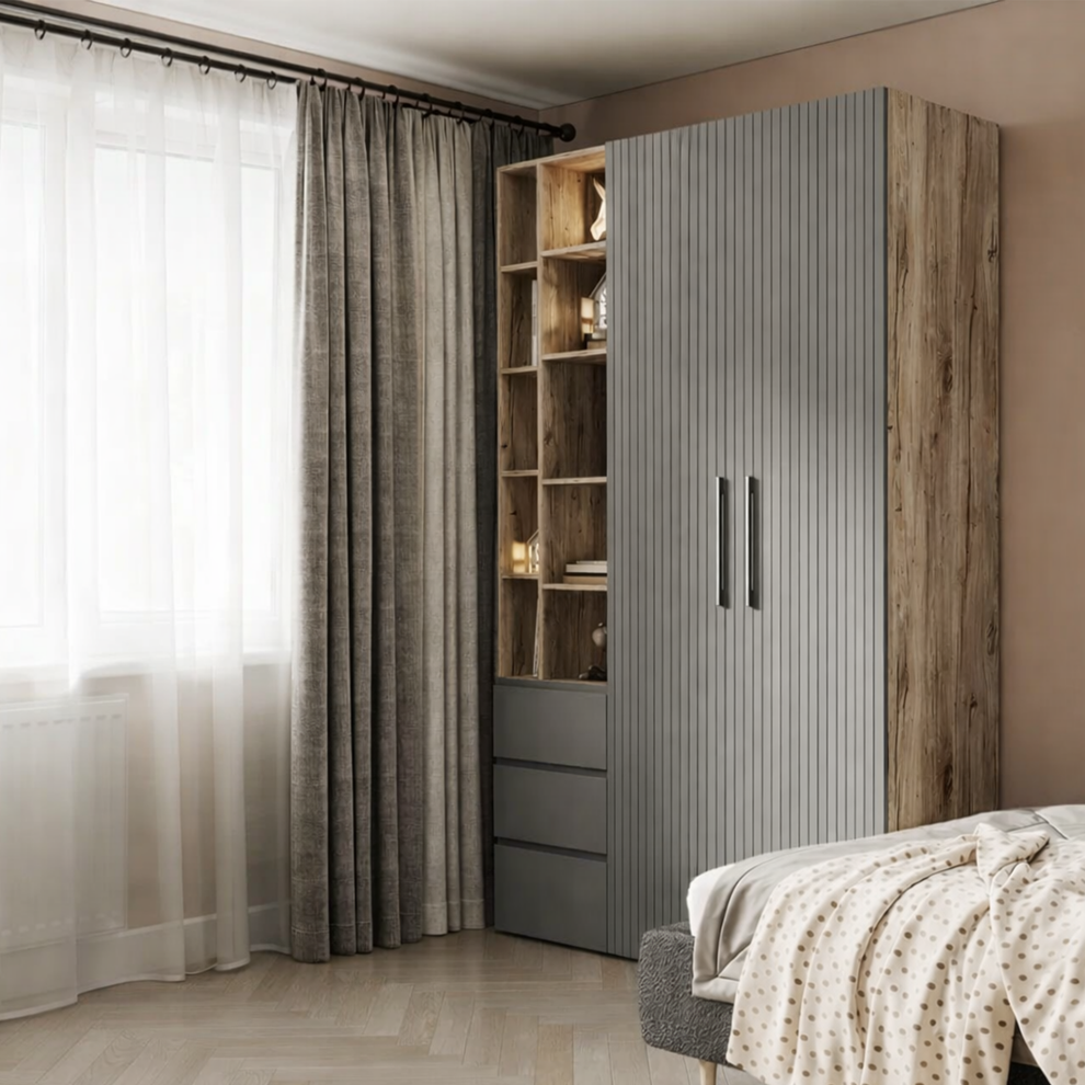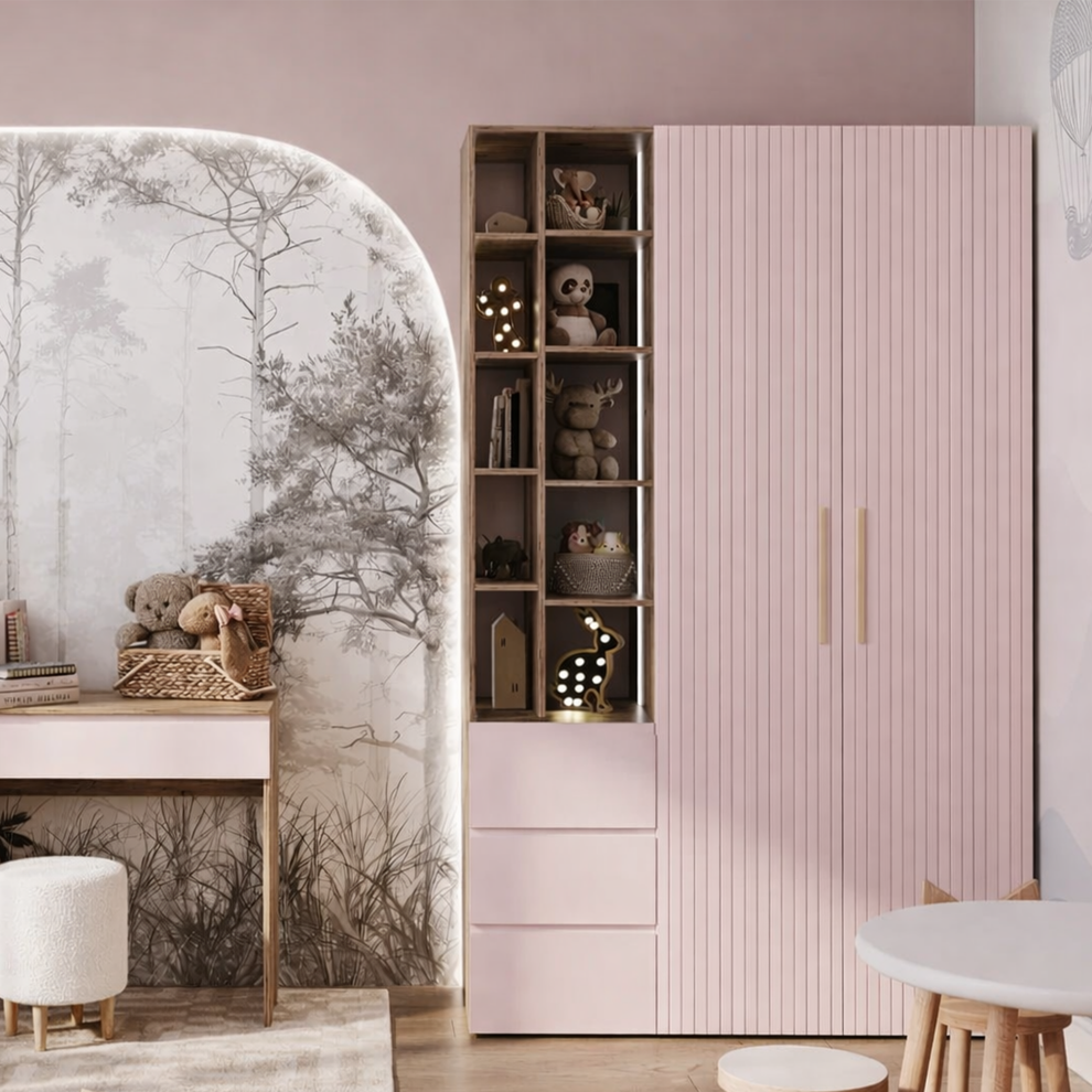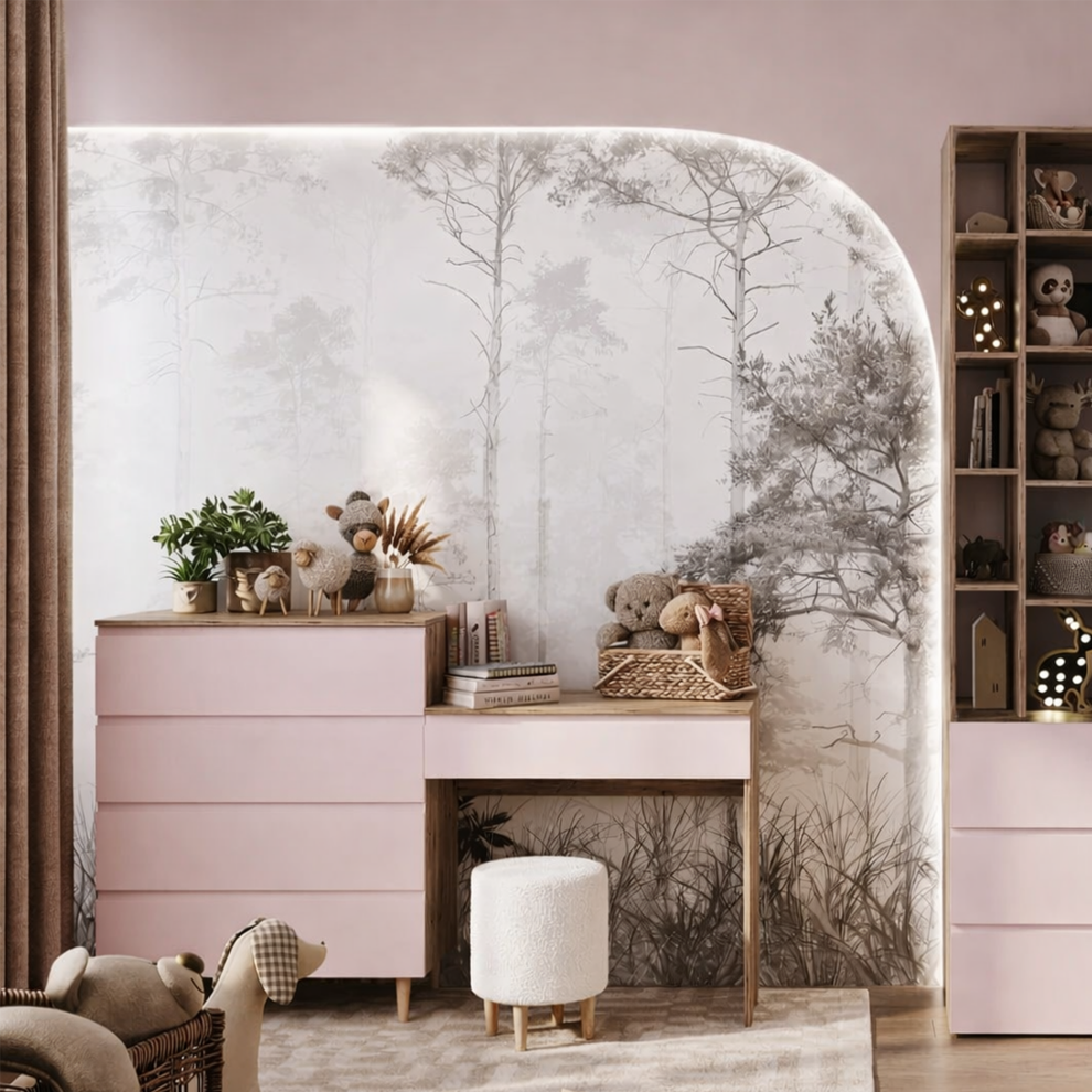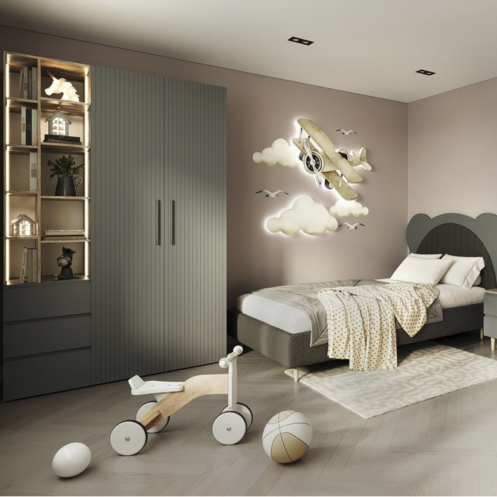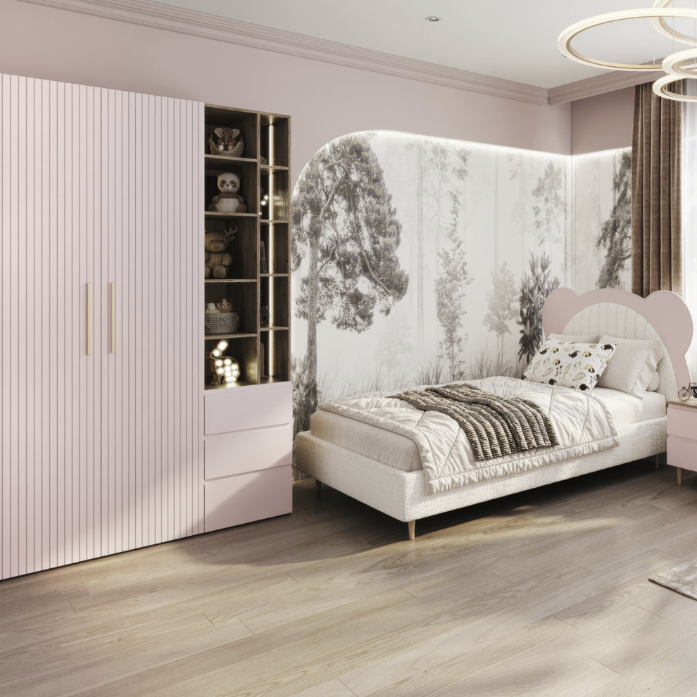 Коллекция объединяет стильный современный дизайн, мягкие формы и тёплые натуральные оттенки, создавая спокойную и гармоничную атмосферу в комнате. В комплект входят удобная кровать с декоративным изголовьем в форме мишки, вместительный шкаф, прикроватная тумба, комод и рабочая зона со столом. Продуманная система хранения помогает поддерживать порядок, а эргономичная мебель обеспечивает комфорт в повседневной жизни.