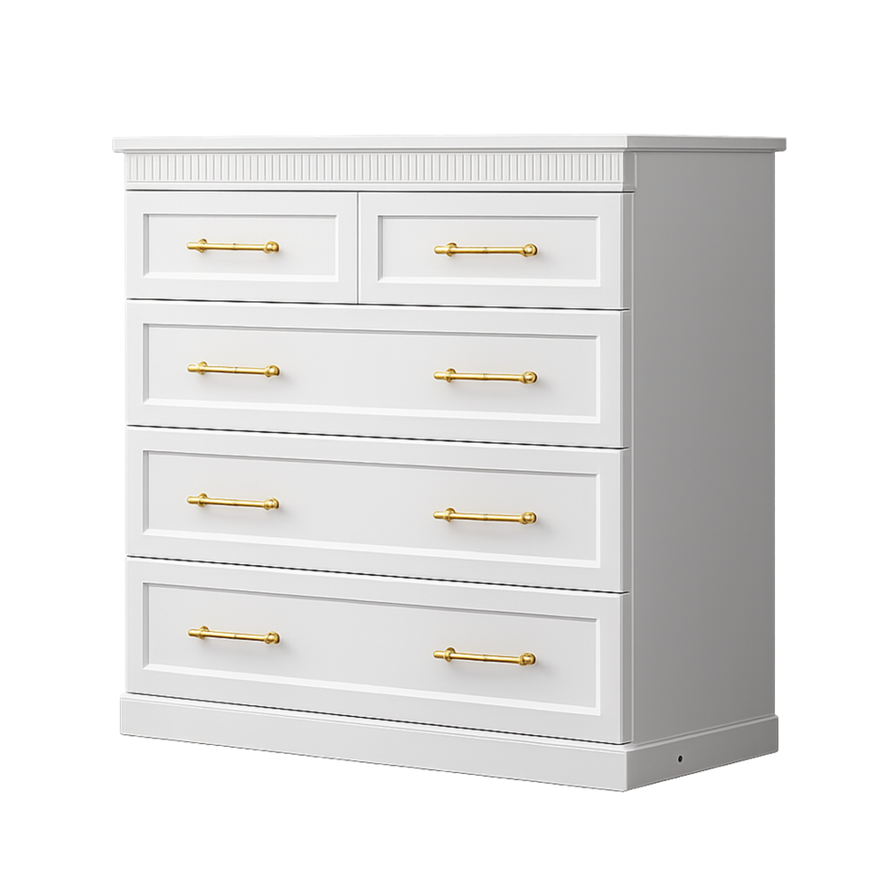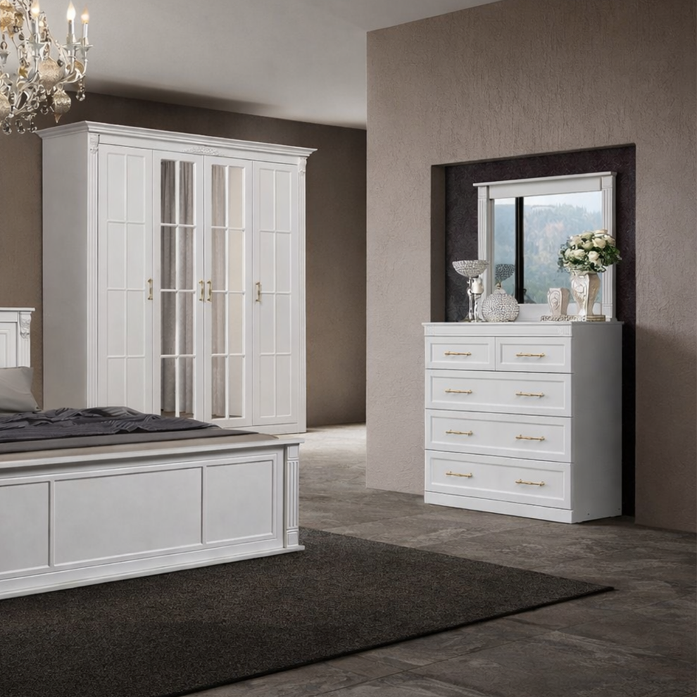 Комод «Александрия Люкс» — элегантная модель в классическом стиле. Белоснежный корпус с фрезеровкой и золотые ручки придают изысканный вид, а вместительные ящики удобны для хранения.