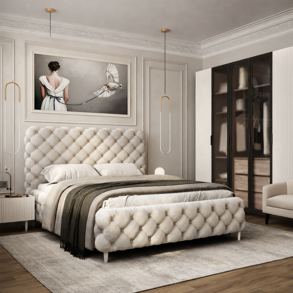 Кровать «Наоми» — элегантная модель с мягким объёмным изголовьем в каретной стяжке. Выразительный дизайн, плавные формы и высокий уровень комфорта создают атмосферу уюта и роскоши в спальне.