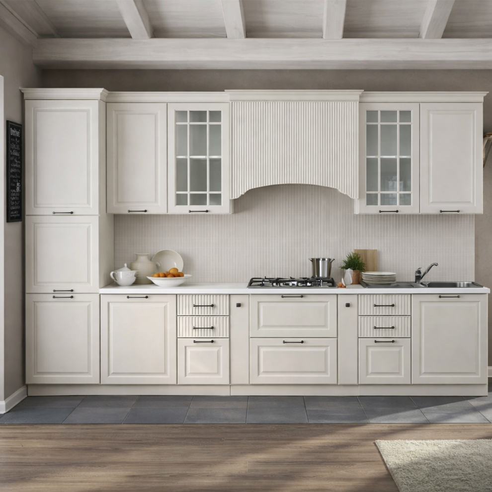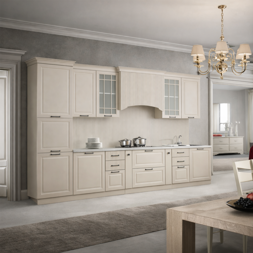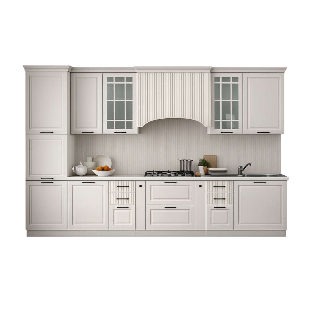 Кухня «Тиффани» — это гармоничное сочетание классического дизайна, функциональности и светлой эстетики. Изящные рамочные фасады, декоративные элементы и витринные шкафы создают атмосферу уюта и благородства, а универсальный светлый оттенок визуально расширяет пространство и делает интерьер более лёгким.