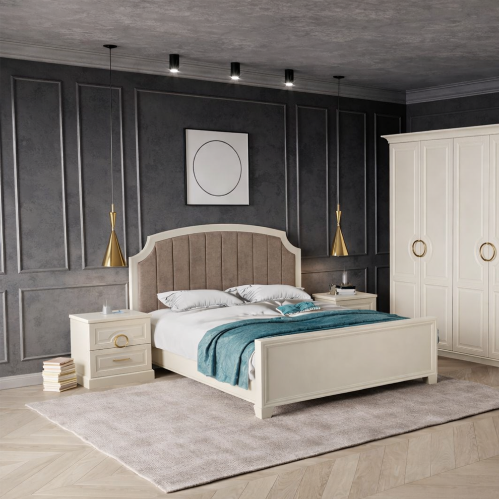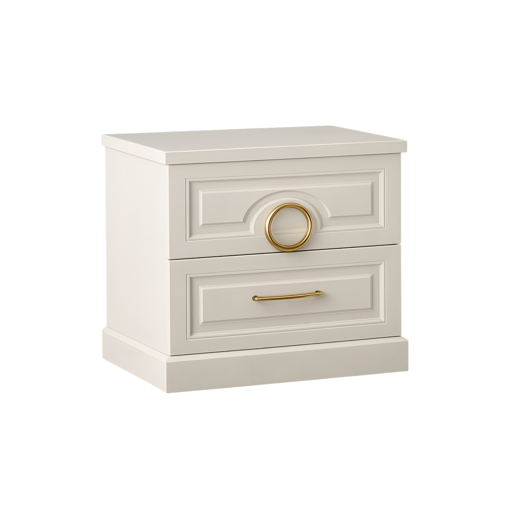 Прикроватная тумба «Адель» — изящный акцент в интерьере спальни. Светлый кремовый корпус с декоративной фрезеровкой и элегантной золотой фурнитурой подчёркивает современную классику коллекции. Два вместительных ящика обеспечивают удобное хранение необходимых мелочей рядом с кроватью, сочетая стиль и практичность.