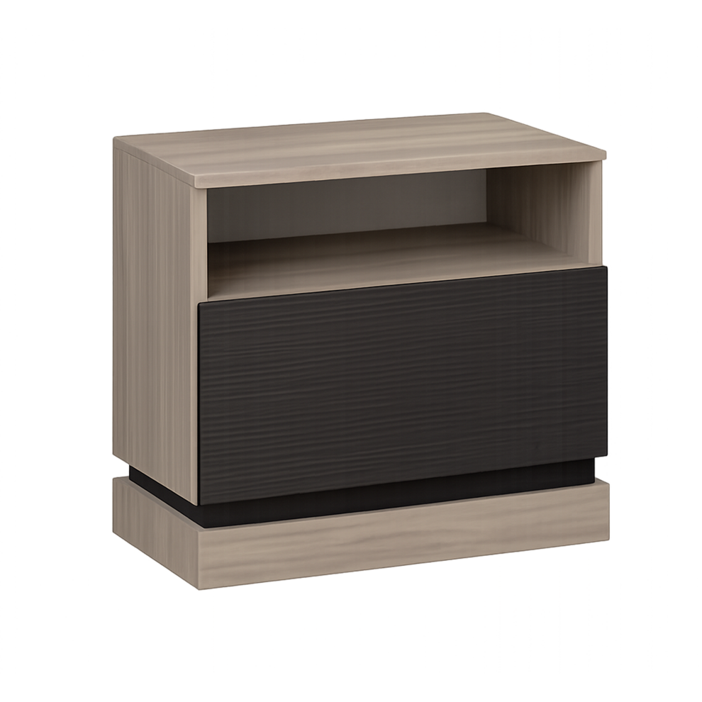 Прикроватная тумба «Комано» — это современное решение для удобного хранения и организации пространства в спальне. Лаконичный дизайн с контрастным сочетанием светлого древесного корпуса и тёмного фасада подчёркивает стиль коллекции и гармонично дополняет интерьер.