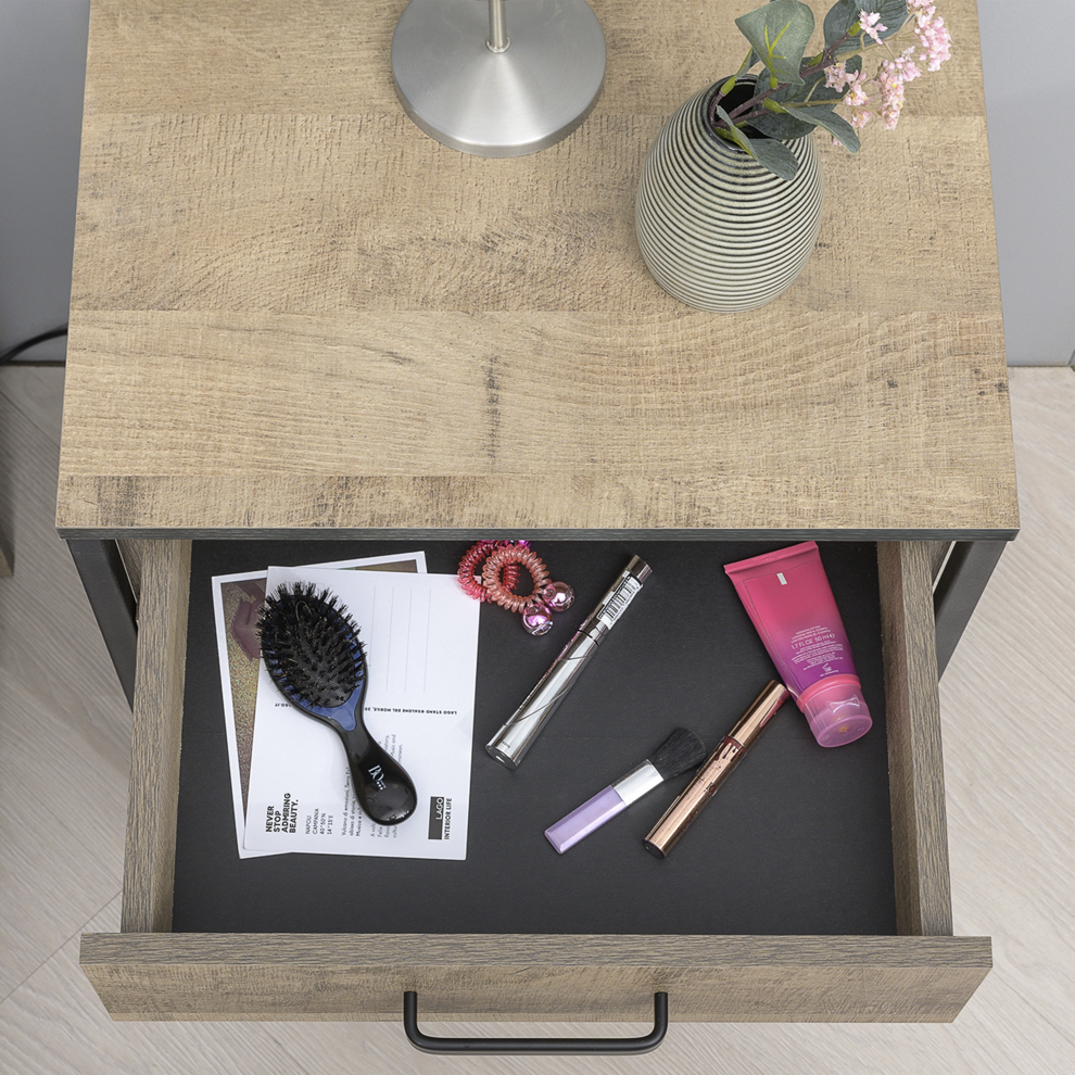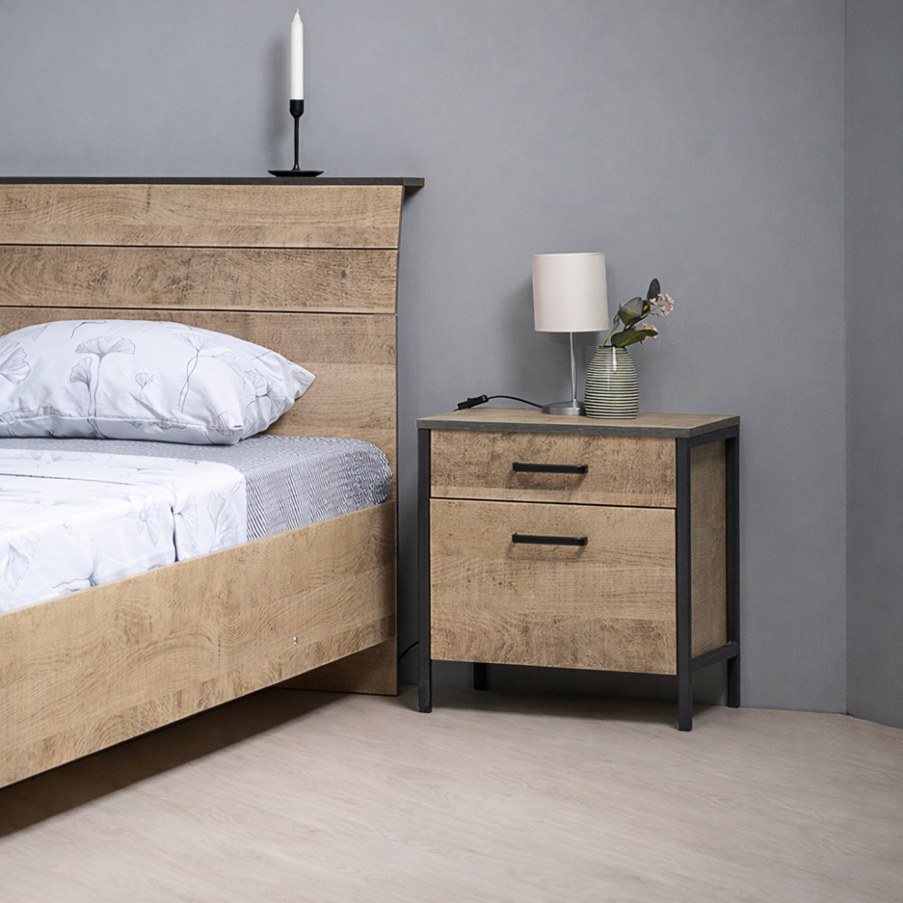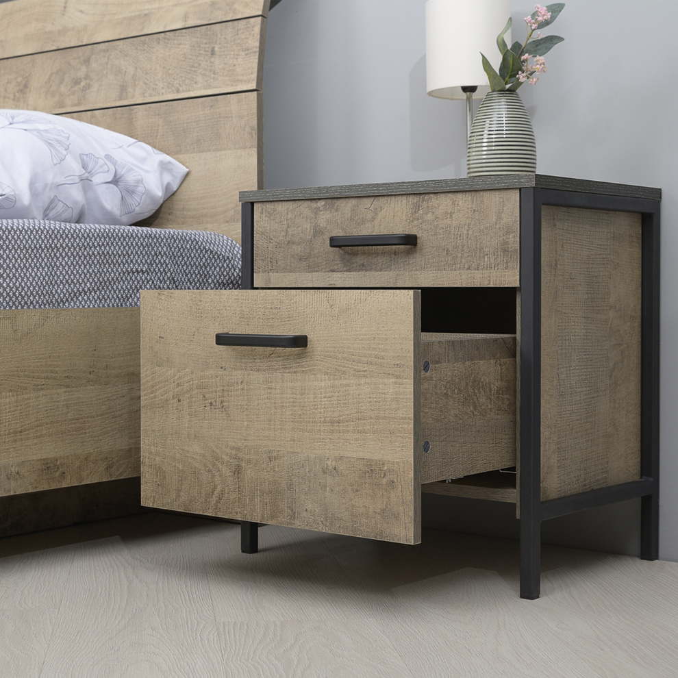 Контрастное сочетание древесного корпуса и чёрного металлического каркаса создаёт эффектный дизайн в стиле лофт и индустриальный стиль. Благодаря компактным размерам тумба идеально подходит для размещения рядом с кроватью.