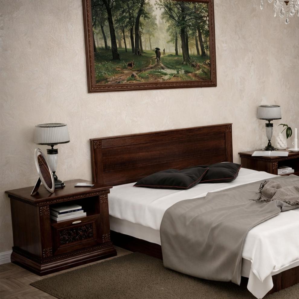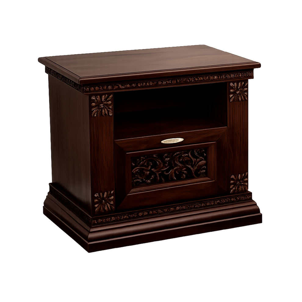 Прикроватная тумба «Версаль» — это гармоничное сочетание роскошного классического дизайна и практичного хранения. Модель выполнена в благородном древесном оттенке и украшена изящной декоративной резьбой, создающей атмосферу уюта и статусной эстетики в спальне.