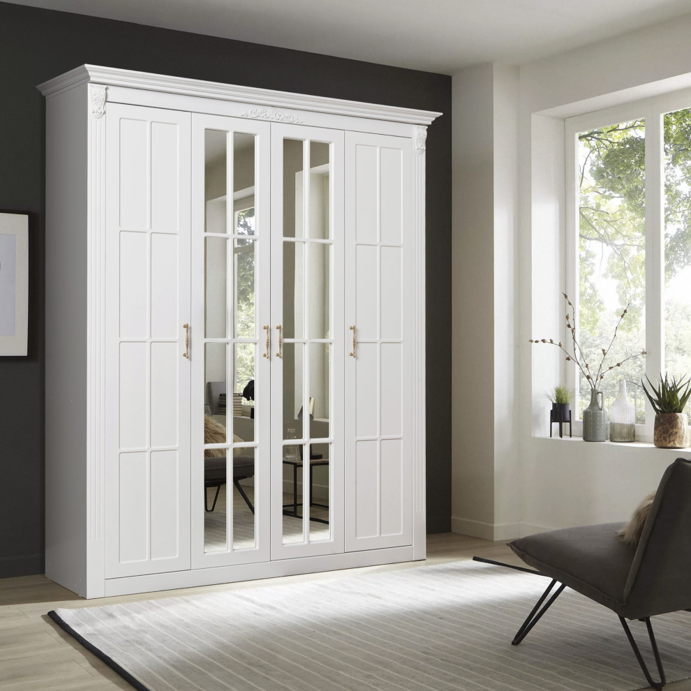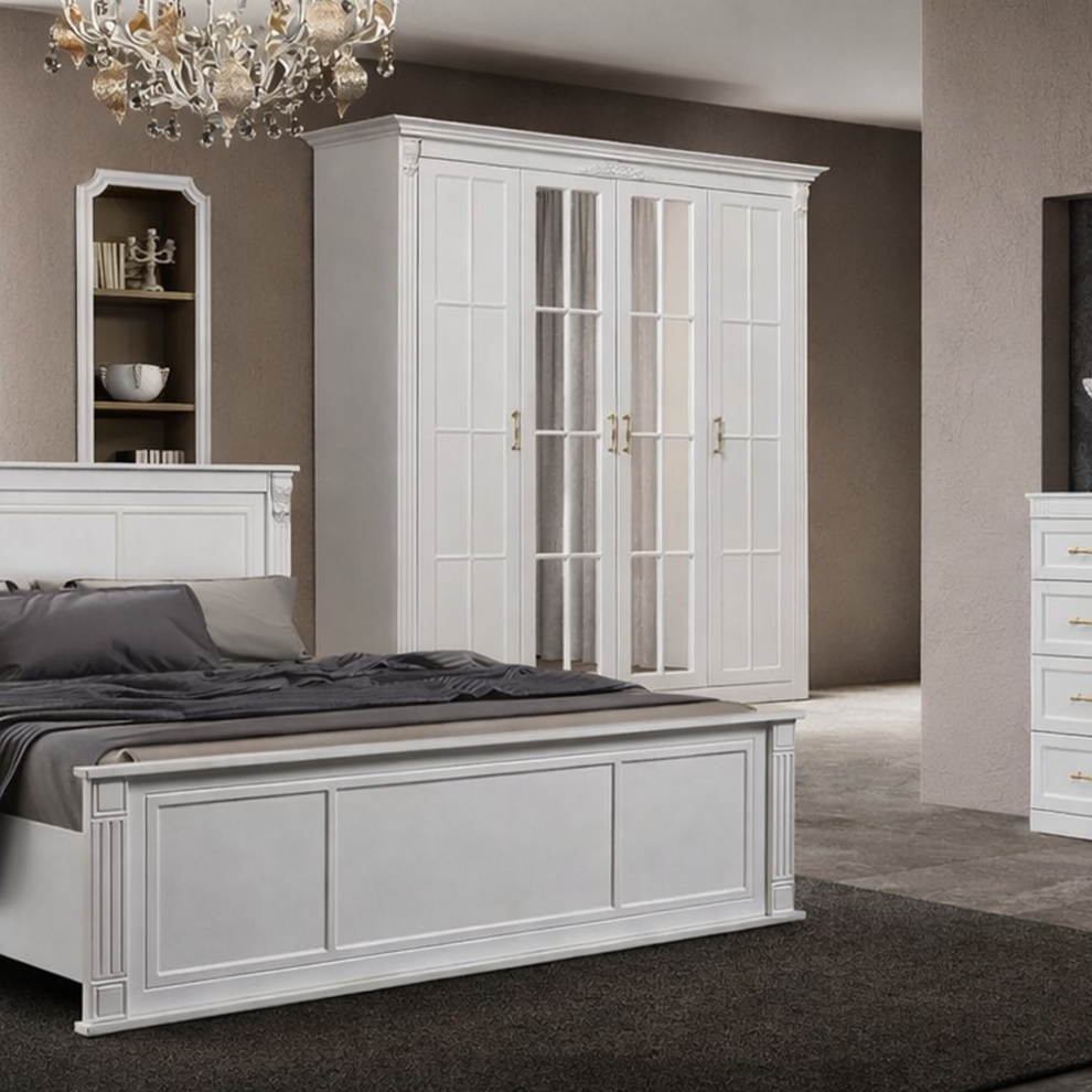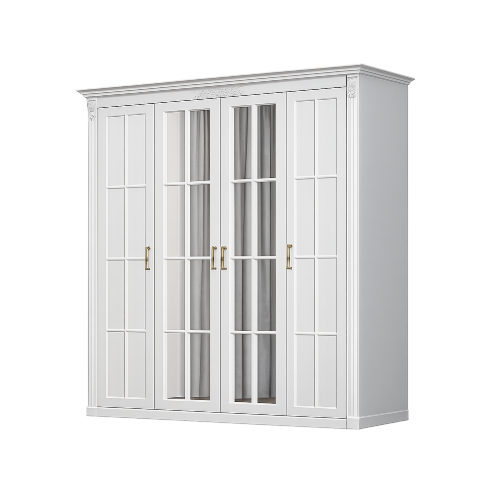 Шкаф «Александрия Люкс» — изысканная модель в классическом стиле с акцентом на элегантность и свет. Белоснежный корпус с декоративным карнизом, стеклянные фасады с раскладкой и благородная золотая фурнитура придают шкафу утончённый и статусный вид. Вместительная конструкция обеспечивает удобное хранение одежды, а светлый дизайн визуально облегчает интерьер и наполняет пространство воздушностью.