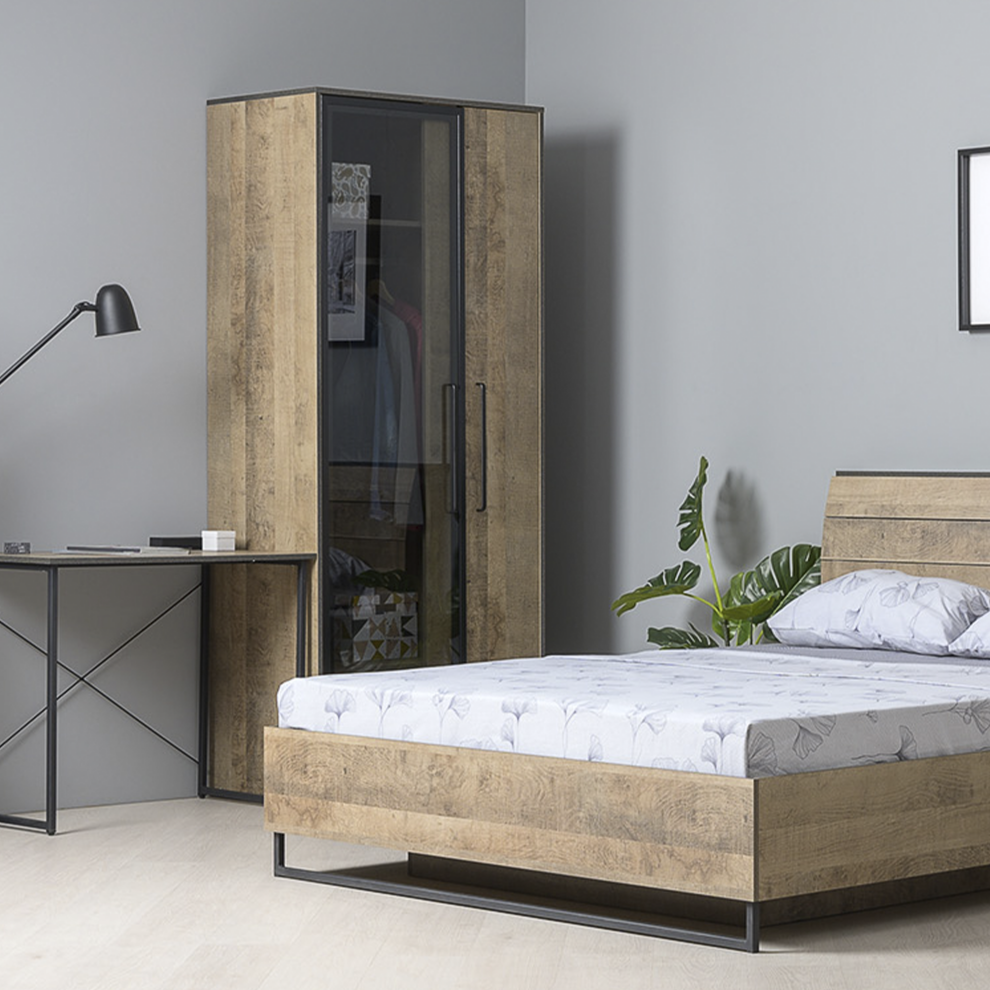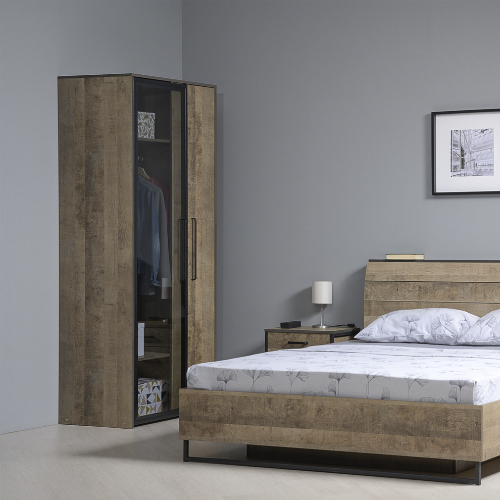 Особенностью шкафа является тонированная стеклянная дверца в чёрной рамке, которая добавляет мебели лёгкость и визуальную глубину. Благодаря этому шкаф может выполнять не только практическую, но и декоративную функцию, позволяя аккуратно демонстрировать содержимое.