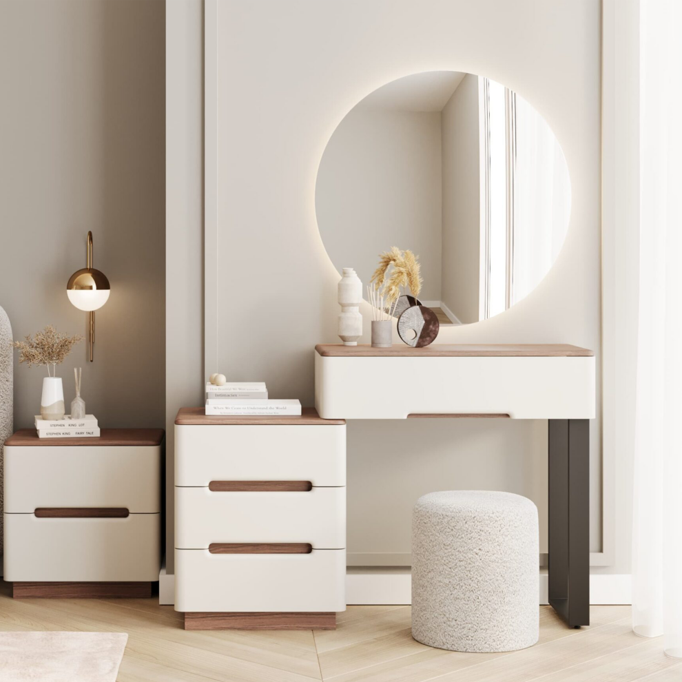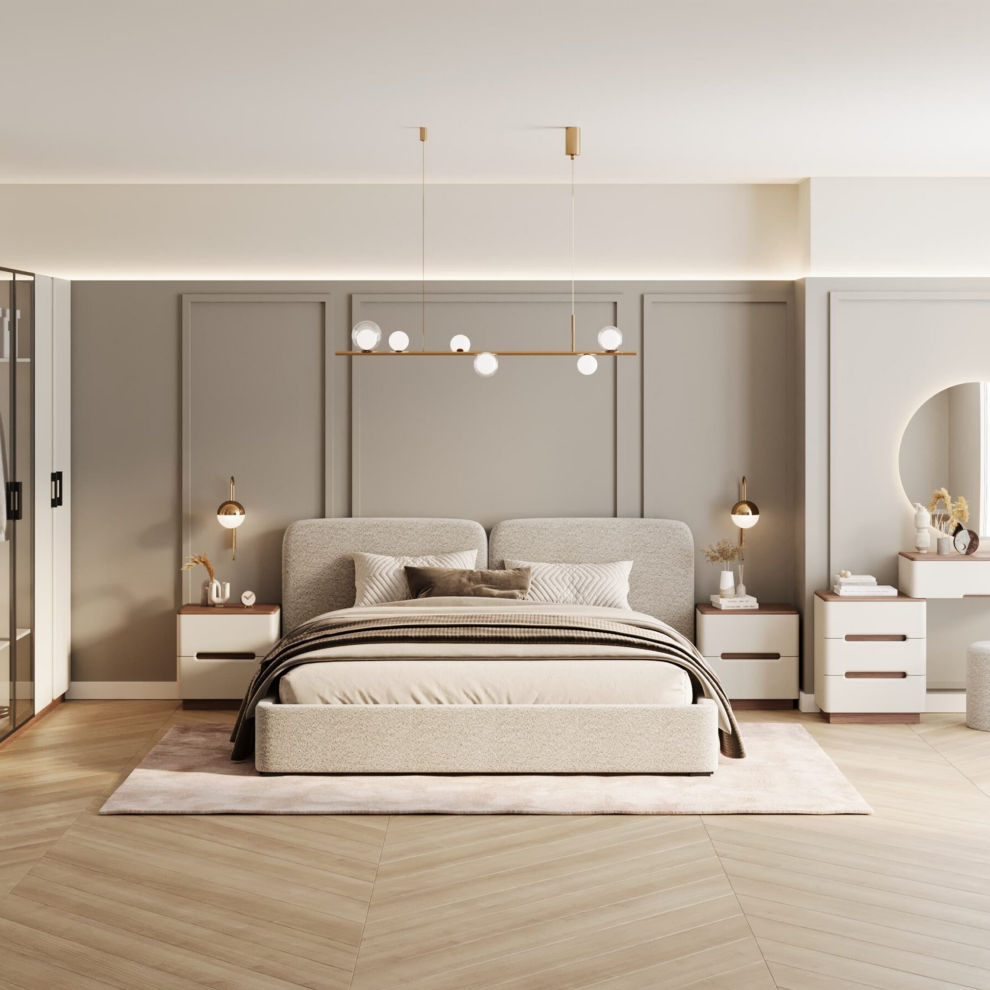 Спальный гарнитур «Мирелла» — это продуманная коллекция мебели для создания комфортного, светлого и современного пространства. Сочетание мягких форм, светлых фасадов и тёплой древесной текстуры формирует атмосферу уюта и визуального спокойствия.
