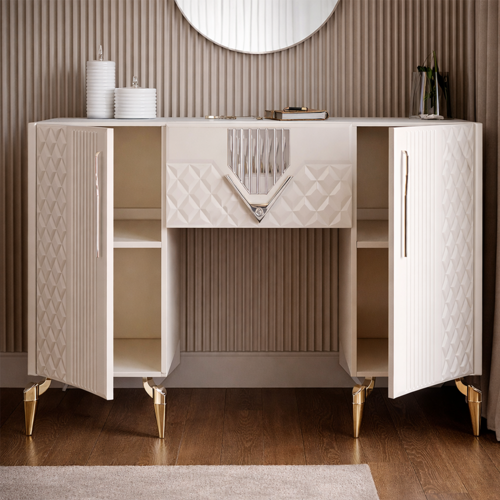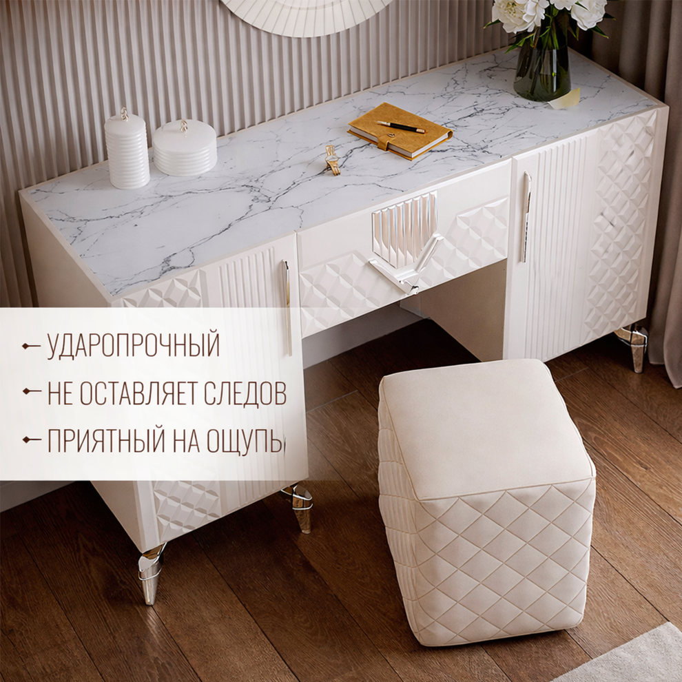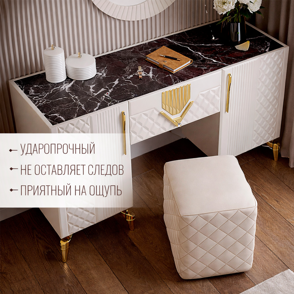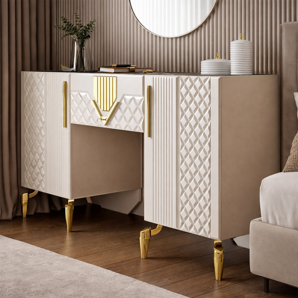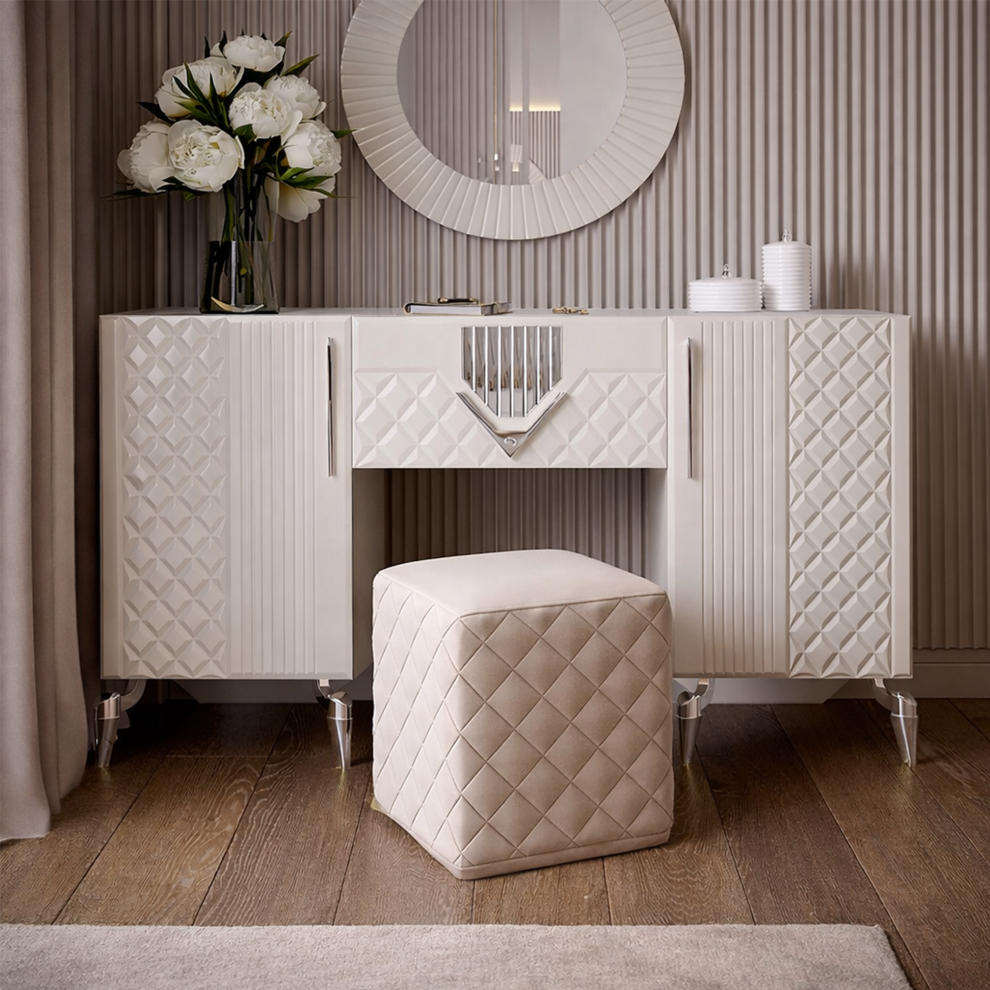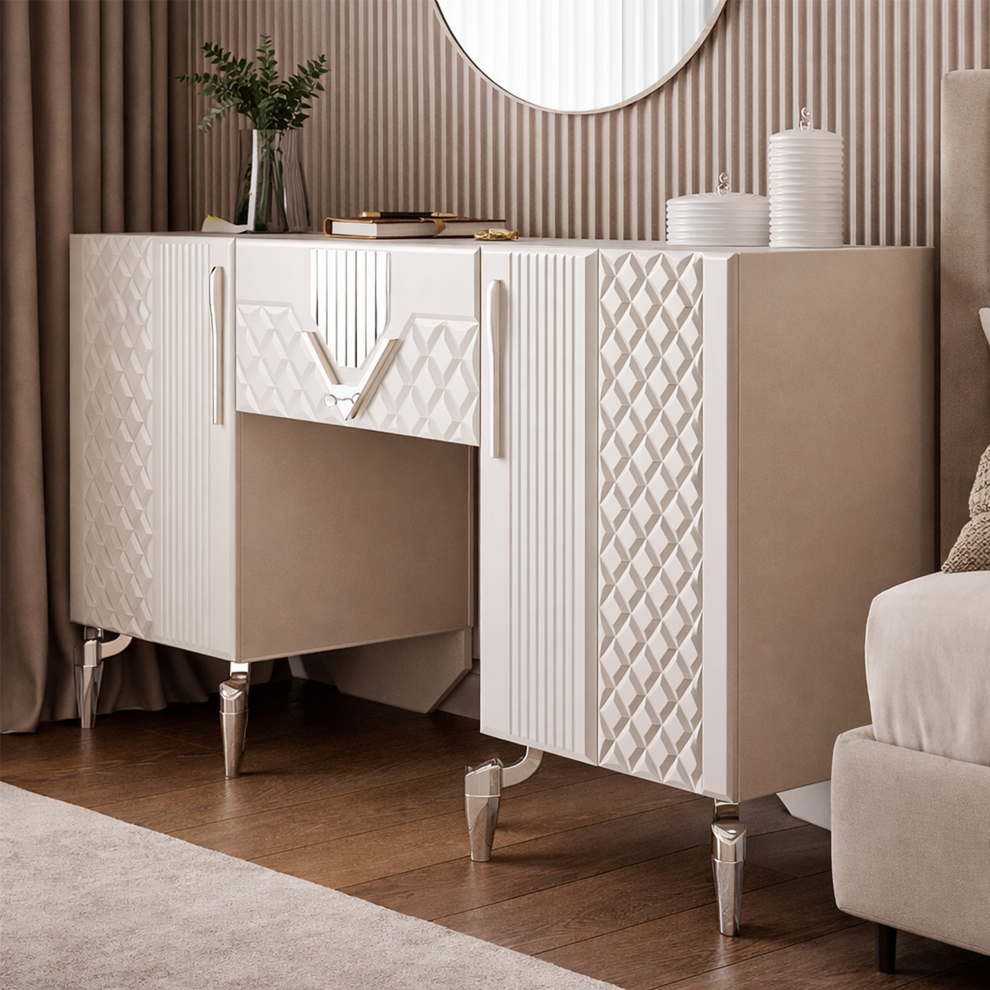 Туалетный стол «Севиль» — изысканный элемент спальни в стиле modern luxury, сочетающий декоративную выразительность и практичность. Рельефные фасады, вертикальная фрезеровка и акцентная золотая или серебряная фурнитура формируют эффектный премиальный образ.