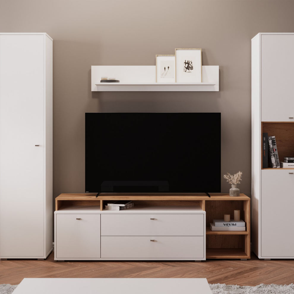 ТВ-тумба «Бэль» — стильный и функциональный элемент мебели для современной гостиной. Модель выполнена в универсальном белом цвете и дополнена декоративными нишами с древесной текстурой, которые создают тёплый контраст и делают интерьер более уютным.